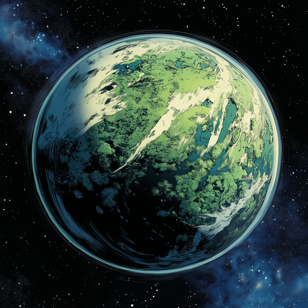 A lush planet teeming with vibrant greenery, its vast forests and sprawling meadows thrive under a golden sun. Towering trees, rich in oxygen, dominate the landscape, while crystal-clear rivers weave through an untouched, fertile paradise, brimming with life.