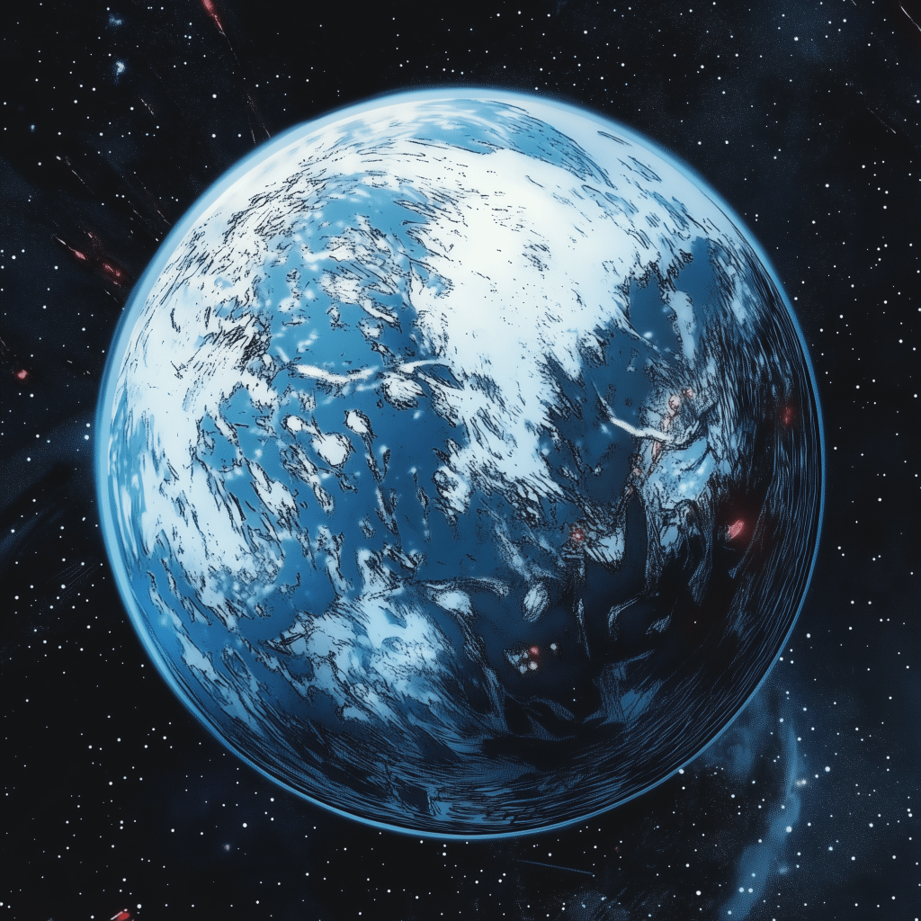 A nearly uninhabitable frozen planet where life clings to survival through advanced infrastructure. Buildings crafted from heat-absorbing materials radiate warmth, creating havens against the biting cold, while insulated pathways connect scattered settlements across the icy terrain.